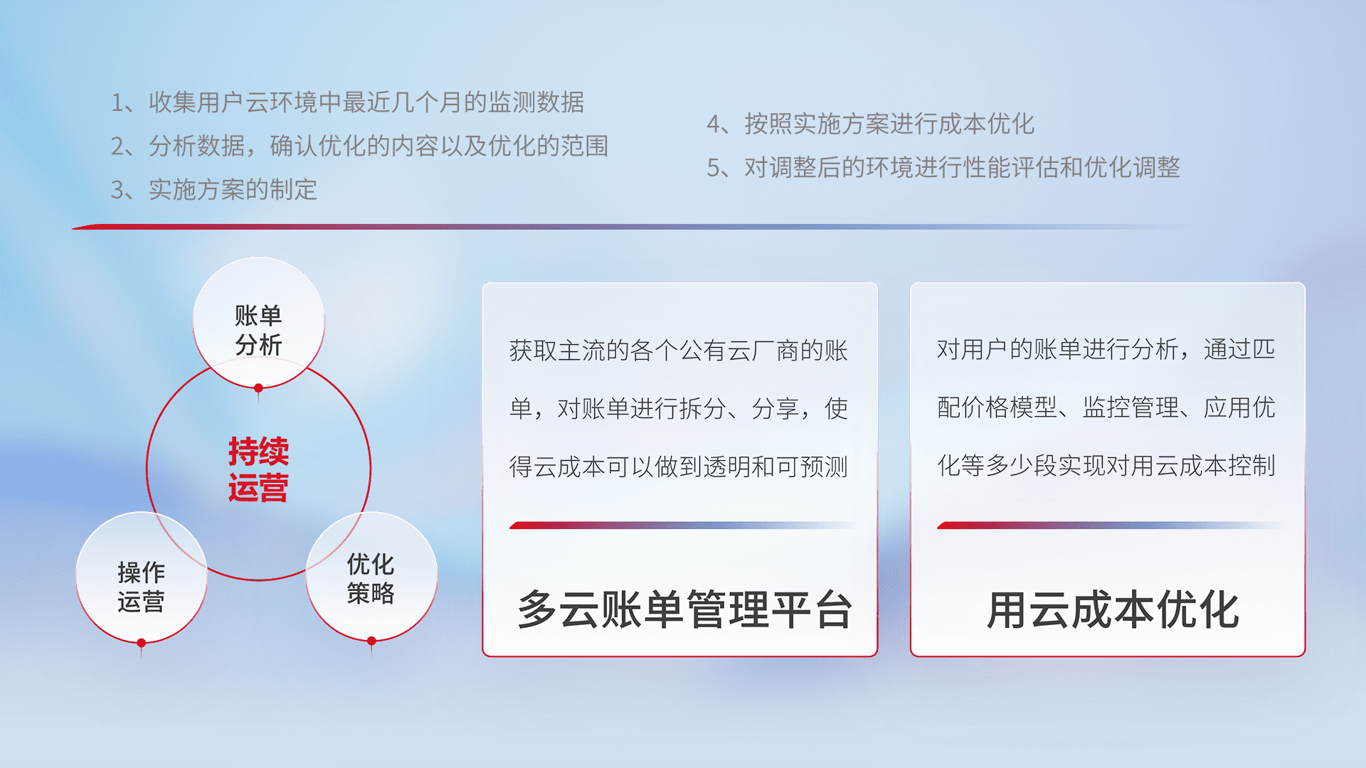 通过多云纳管,,,,以统一的资源数据模型把客户的云资源进行抽象和封装,,,,进而实现对多云资源的统一操作,,保障云资源管理的可靠性、、、稳定性与可用性。。量身定制化运维内容,,,,配置、、、、开发运维、、补丁管理、、、备份、、监控、、、认证和访问管理、、、、审计和日常巡检等,,保障在用云过程中的可靠度,,,,稳定度以及高可用率。。。。