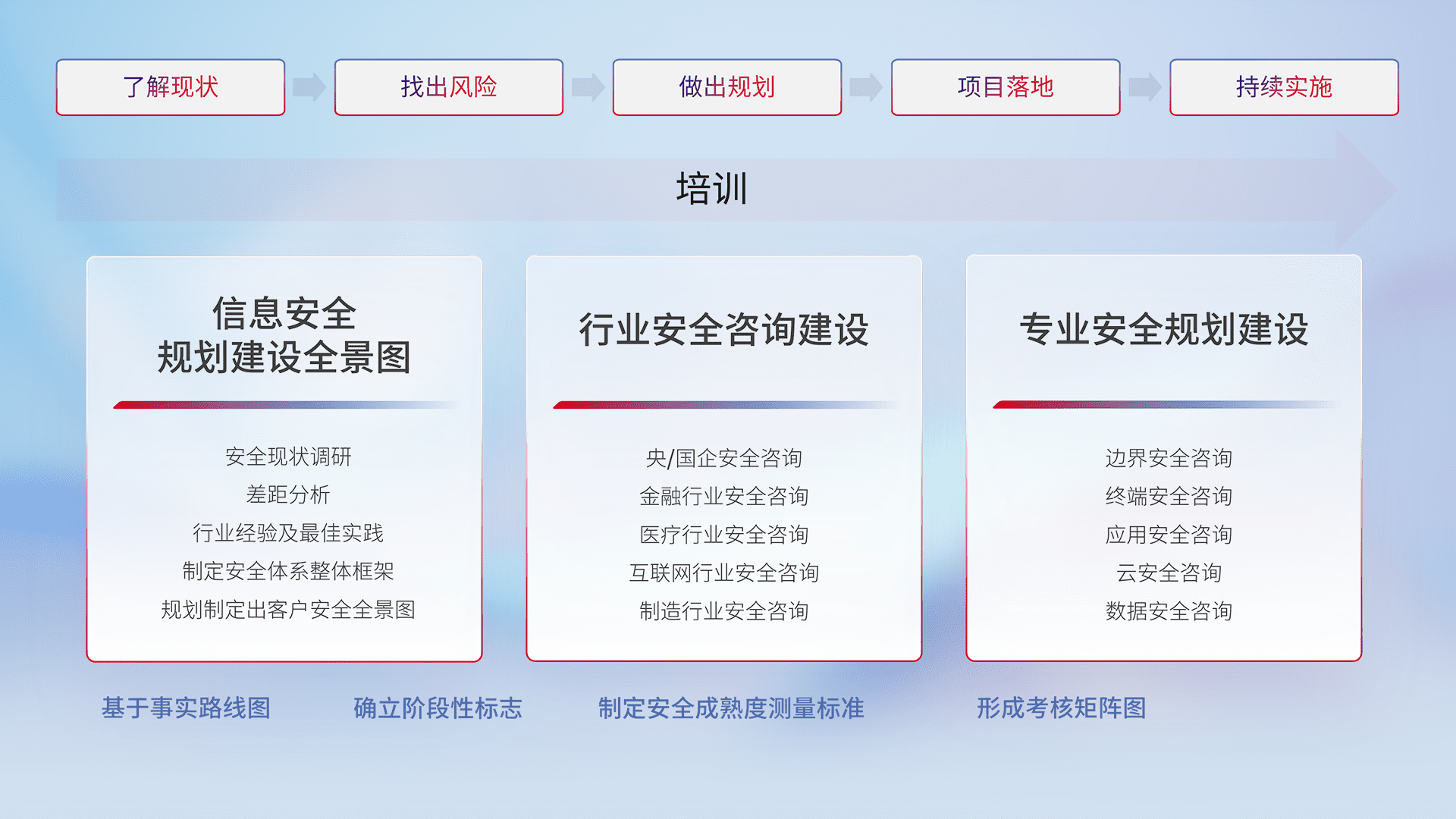 梳理客户信息安全现状调研、、差距分析结果,,结合行业先进经验及最佳实践,,制订客户的信息安全管控体系总结架构,,,最终形成一个完整的客户信息安全规划与建设的全景图。。